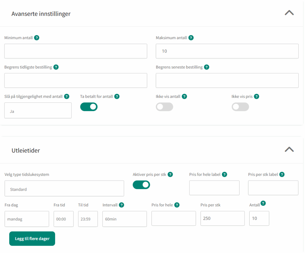 Start med å legge inn hvor mange enheter som kan bookes totalt (f.eks. 10 stk). - Skru på tilgjengelighet med antall