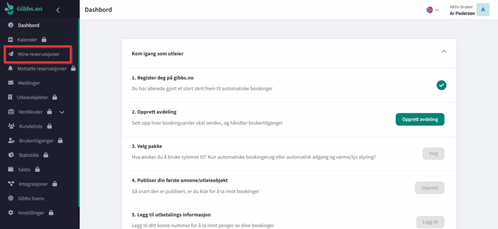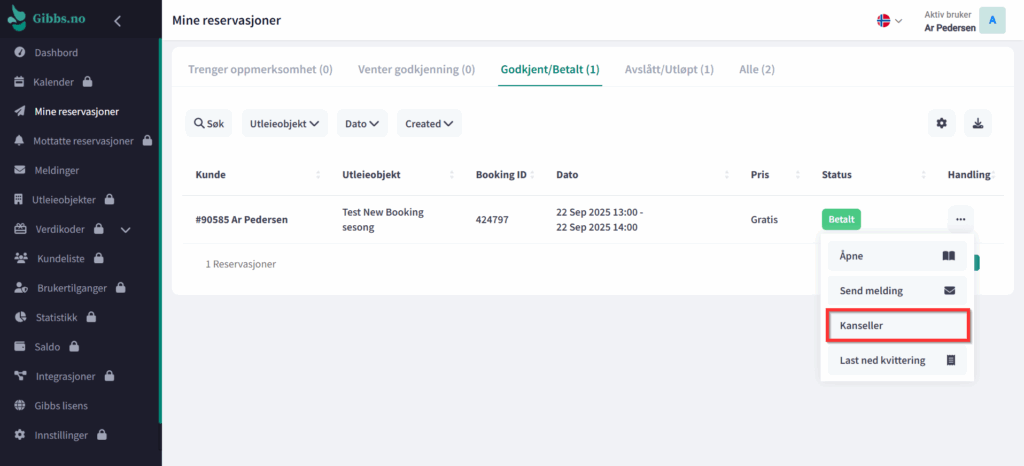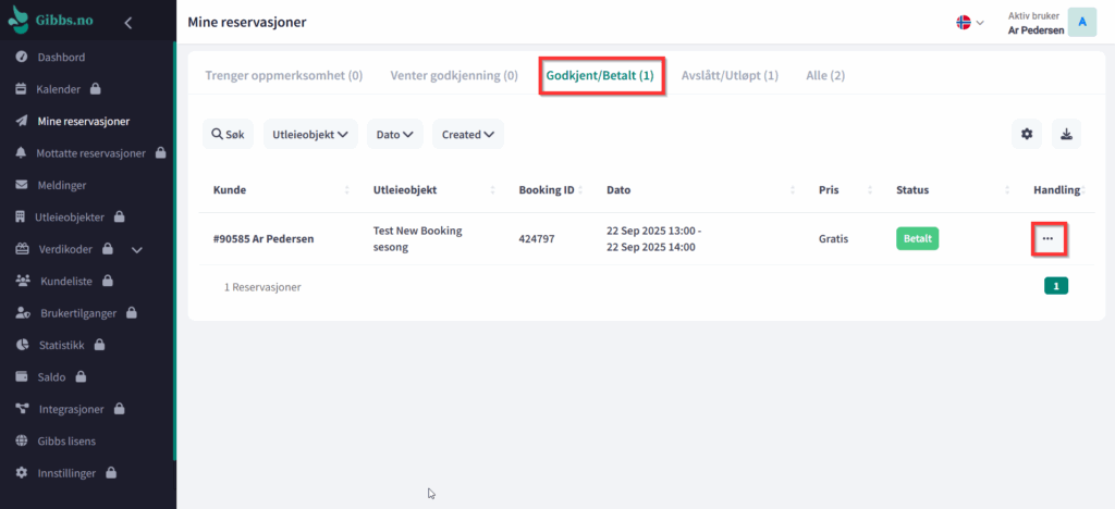 2. På sidepanelet, velg gå til «Mine reservasjoner» -> Fanen «Godkjent/Betalt» -> «Handling»