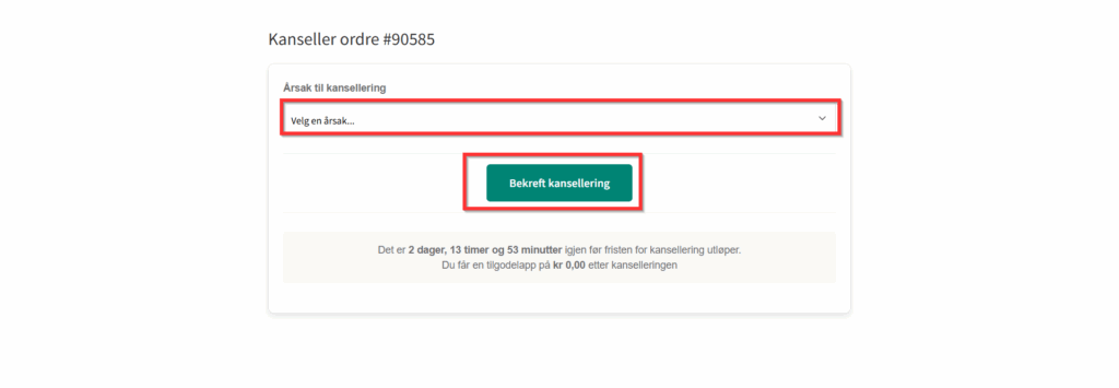4. Her må du velge årsak og deretter trykk på bekreft kansellering, på bunden kan du også se hvor mye du vil få igjen som tilgodelapp