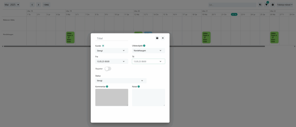4. Hvis du bruker bookingkalenderens tidsluker, kan du ikke sette opp gjentakende stengte perioder. Du må derfor legge inn hver stengte periode individuelt. Alternativt, hvis en booking repeteres hver mandag fra kl. 17:00-18:00 i perioden 10. januar til august 2023, kan det være enklere å markere disse tidene som stengt under «Mine annonser» for å unngå manuell registrering av hver enkelt økt.
