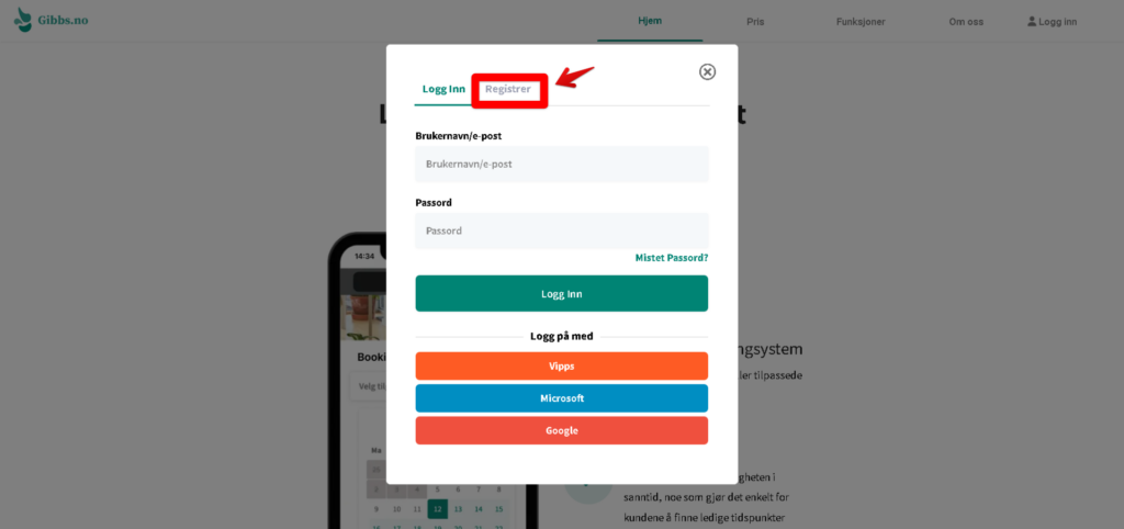 Løsningen har flere alternativer for pålogging og registrering. Du kan logge inn med Vipps eller Google eller registrere en bruker i systemet.