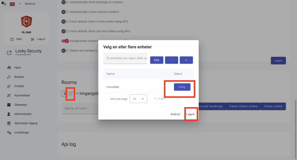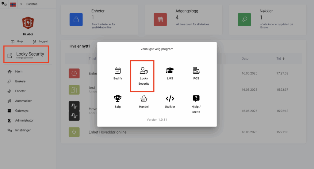 Velg ønsket metode for åpning/lukking av låsen (for eksempel via app eller kode).