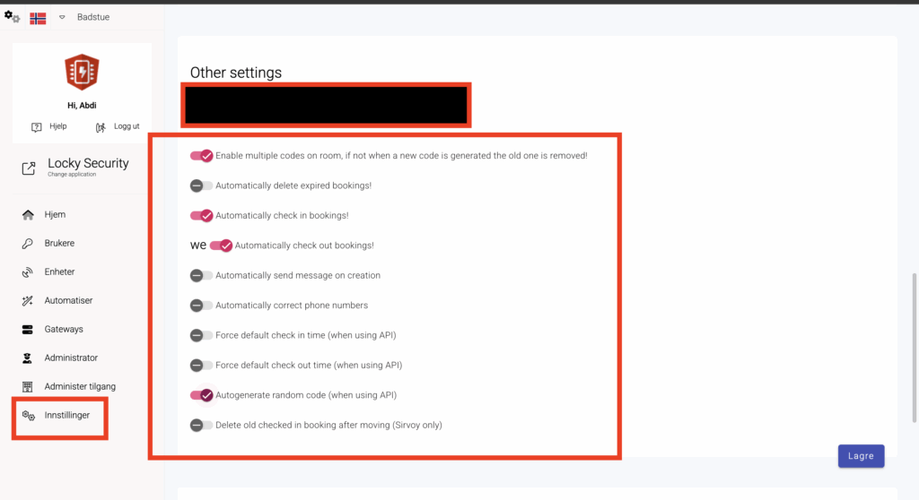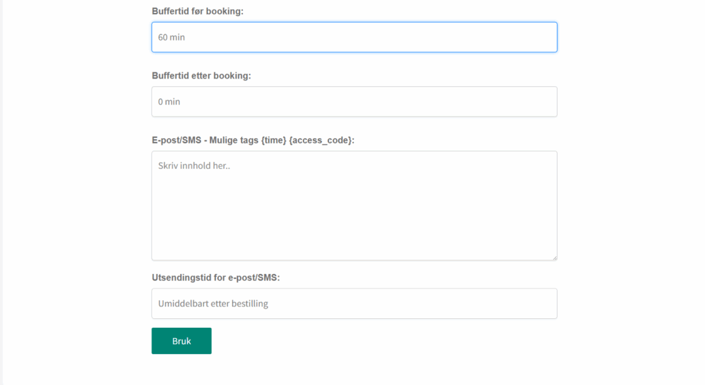 E-post/SMS: Her lager du en mal for hvordan meldingen til kunden skal se ut – for eksempel ved utsendelse av e-post eller SMS. Se eksempelet i bildet under. Husk å bruke taggene {time} og {access_code} der du ønsker at systemet automatisk skal fylle inn tidspunkt og adgangskode.