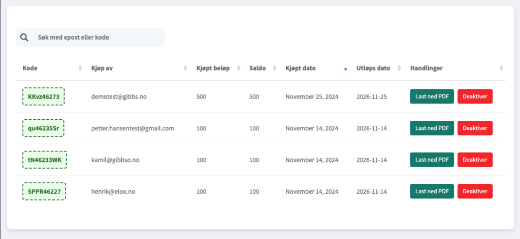 Øverst finnes et søkefelt hvor du kan søke etter gavekort basert på e-postadresse eller gavekortkode. Dette gjør det enkelt å finne spesifikke gavekort.