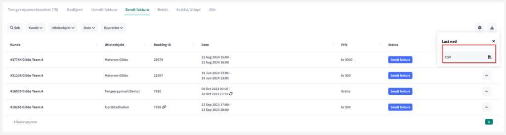 3. Klikk på last ned som csv. Da vil det lastes ned en fil som inneholder alle nødvendige bookingdetaljer. Mulig å filtrere selv i excel senere om det er for mye data.
