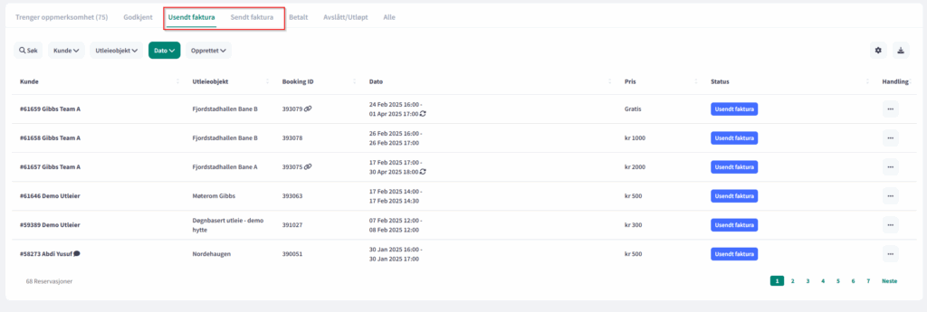 Under denne fanen ligger alle ordrer der betalingsmetoden faktura er valgt. Dette kan også være andre ordrer som har status “sesongbooking”