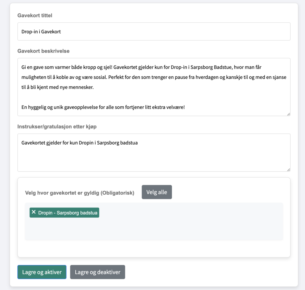Gyldighet: Velg hvor gavekortet kan brukes (klikk “Velg alle” for alle lokasjoner).