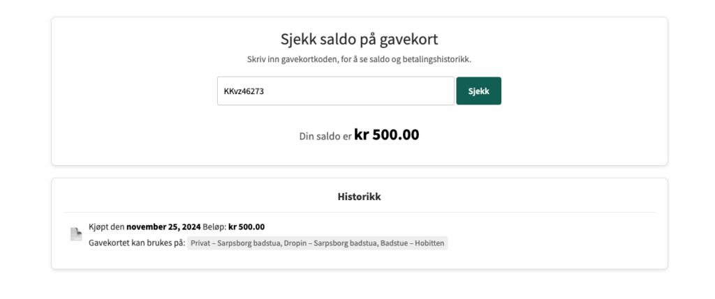 Under saldoen vil du finne en oversikt over gavekortets historikk, inkludert dato for kjøp, beløp, og hvor gavekortet kan brukes.